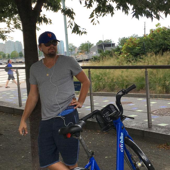 Leonardo DiCaprio took a break from his bike ride in Manhattan’s Hudson River Park in New York to have a puff on his vape cigarette.