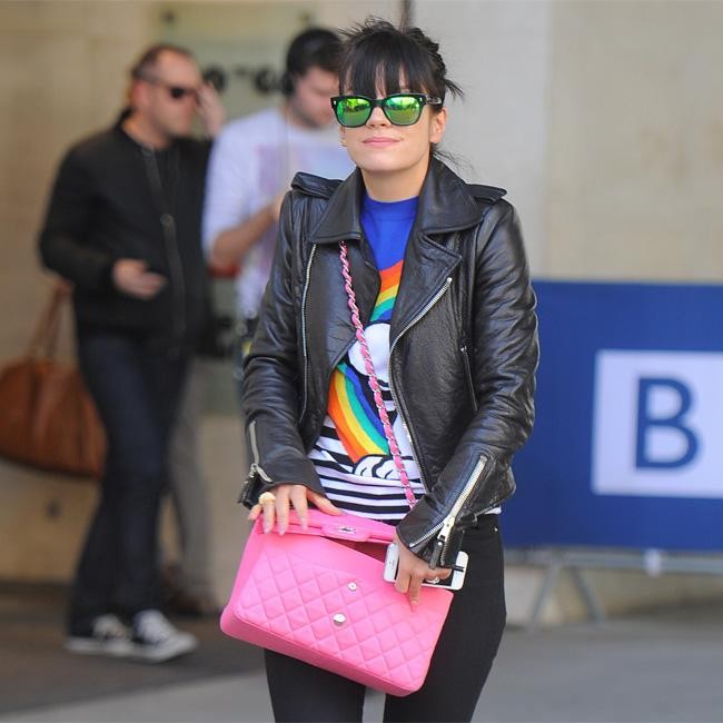 Lily Allen was in high spirits as she left the BBC Radio 1 studios in London. The singer teamed a colourful tee with a vibrant pink bag and mirrored shades.
