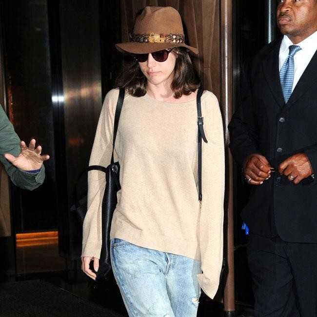 Lizzy Caplan covered up in a pair of stonewashed boyfriend jeans, caramel coloured jumper and a tan fedora hat as she left her hotel in New York City.