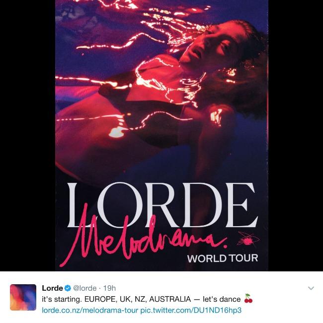 Posting a picture of her tour poster on the micro-blogging site, the ‘Green Light’ singer wrote: "it’s starting. EUROPE, UK, NZ, AUSTRALIA — let’s dance https://lorde.co.nz/melodrama-tour (sic)"