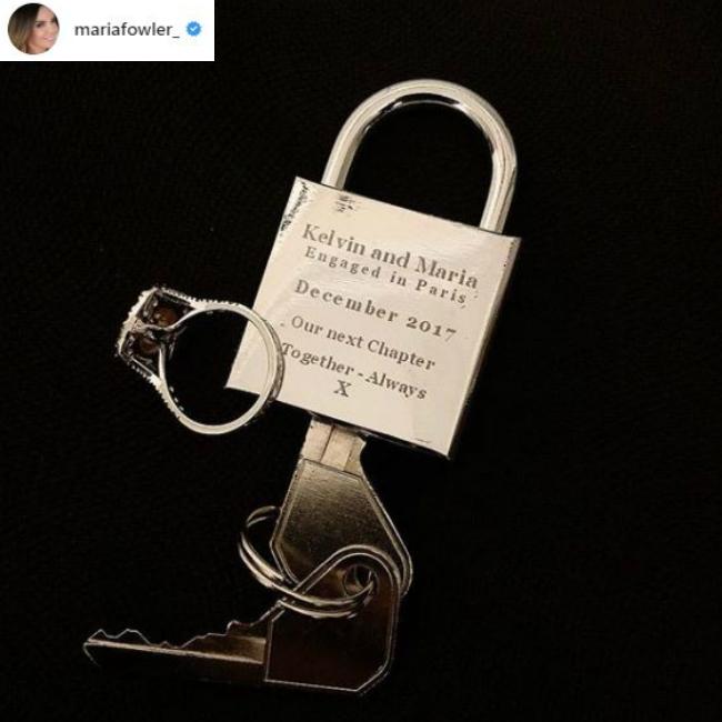 The brunette beauty’s lock is engraved with the words: "Kelvin and Maria. Engaged in Paris. December 2017. Our next Chapter. Together – Always X (sic)"