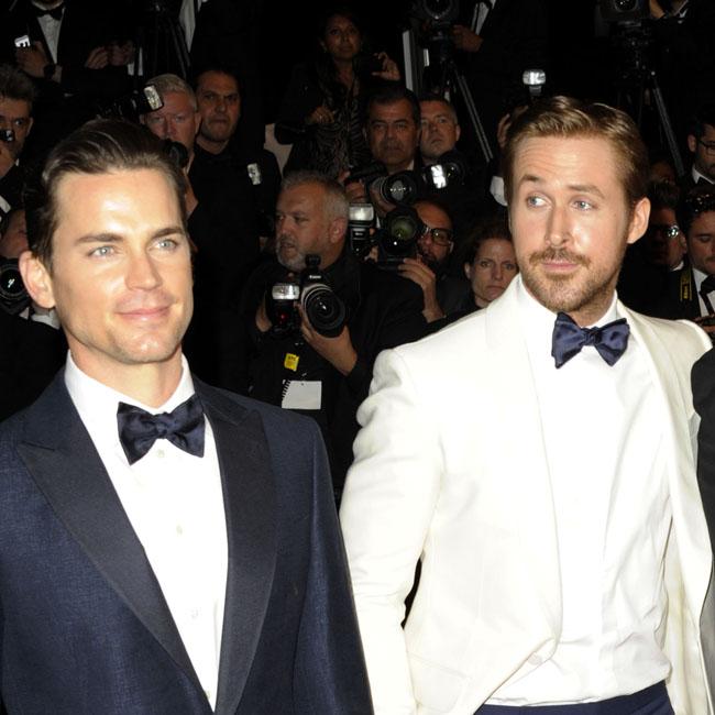 The Hollywood hunks matched with Ryan wearing a white suit and blue bow tie and Matt a blue suit and the same bow tie as the ‘Drive’ actor.