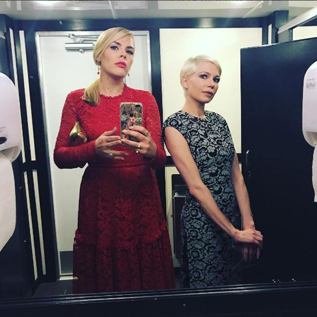 Busy shared a photo of herself and Michelle standing in between two hand towel dispensers outside toilet cubicles and wrote: "Michelle and I like this picture of ourselves in a porta potty better than any red carpet pics we saw. So here you go.(sic)"