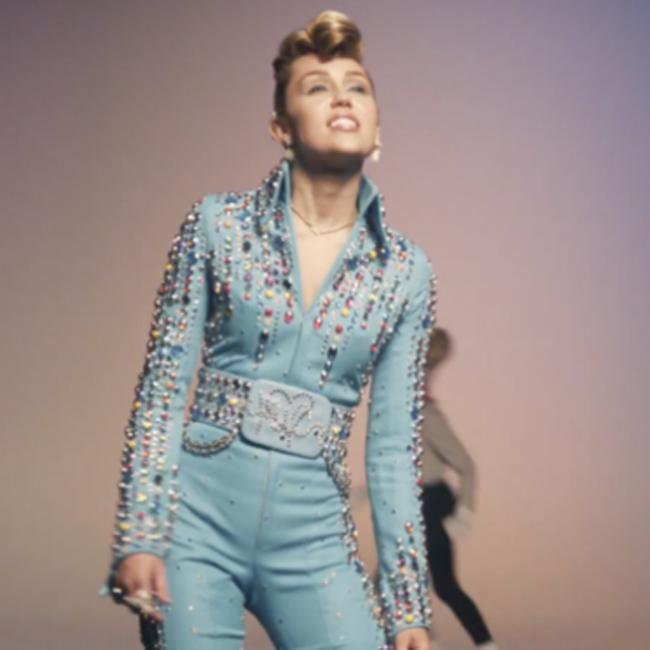 The promo for the track sees the ‘Wrecking Ball’ singer rock a number of looks, including a rhinestone-encrusted all-in-one with her hair in an Elvis-esque quiff while she prances around with puppets.