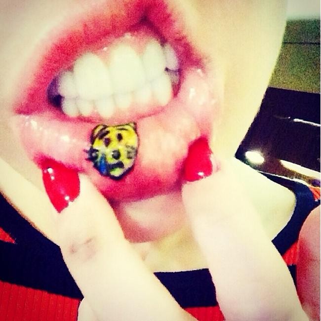 The tattoo can only be seen when Miley pulls down her bottom lip to reveal the cat, her latest in a string of designs covering her body.