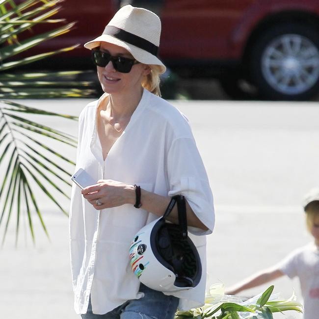 Naomi Watts treated herself to a bouquet of flowers as she enjoyed a day out with her family at a farmers market in Brentwood, CA. The actress opted for a lose fitting white shirt and denim shorts.