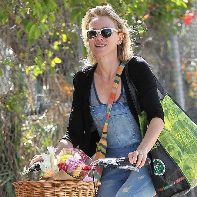 Naomi Watts enjoyed a bike ride in Brentwood, California where she visited a flower market with her family while wearing denim dungarees and white framed sunglasses.