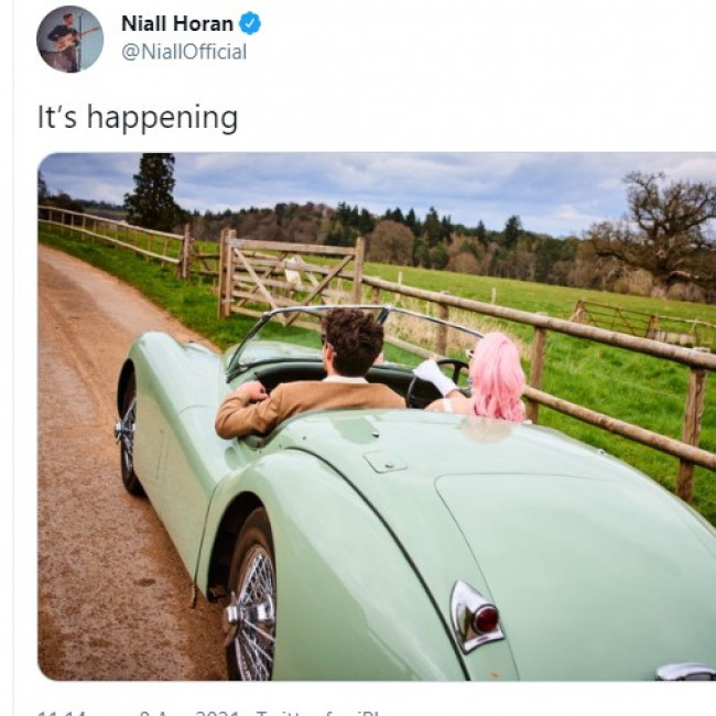 Niall took to Twitter to share a picture of himself and the cotton candy-haired pop star in glam attire in a pale green classic motor this week.
