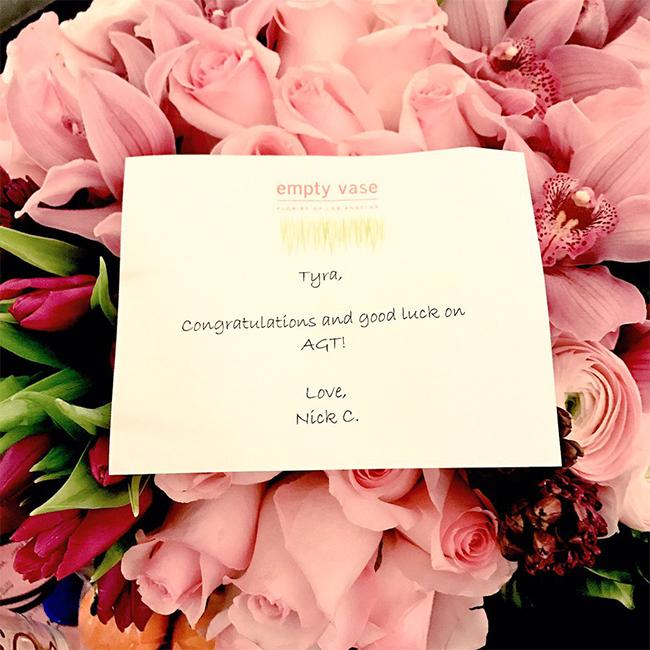 Taking to Twitter, Tyra uploaded a photograph of the flowers, with a note, which read: "Tyra, congratulations and good luck on AGT! Love Nick C. (sic)"