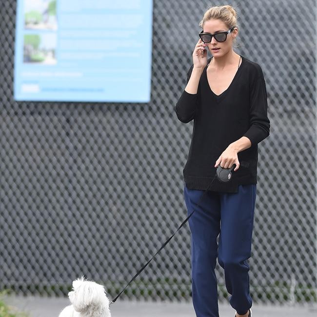 American socialite Olivia Palermo was almost unrecognisable as she walked her dog in Brooklyn, New York. She took a break from her usual high fashion style and wore blue sweatpants and black trainers.