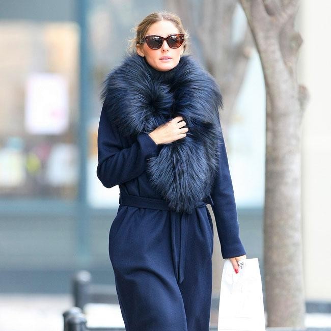 Olivia Palermo grabbed a snack while out and about in New York City on Sunday morning. The fashionista shielded herself from the cold in a long navy coat and fur stole but added a burst of colour with a red dress.