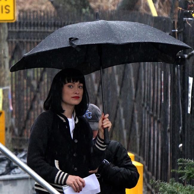Olivia Wilde braved the heavy rain on Tuesday (28.03.17) when she stepped out under an umbrella wearing a black wig on the ‘Life Itself’ movie set in the Bronx, New York.
