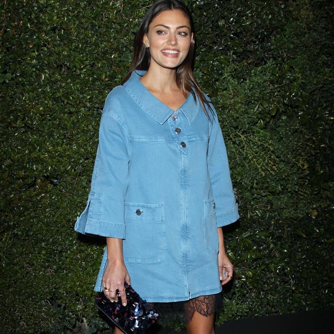 Phoebe Tonkin rocked a bold blue denim shirt dress to Pharrell’s Chanel dinner.
