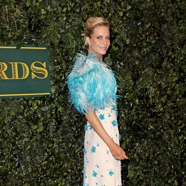 Poppy Delevingne put on a colourful display in a white dress with a delicate aqua-coloured flowers attached to it and a matching fluffy bolero.