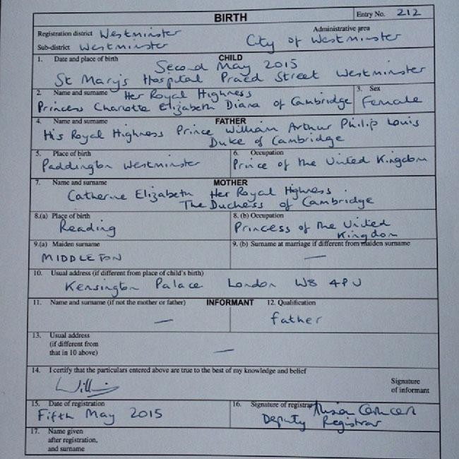 A statement from Kensington Palace read: "The Duke and Duchess of Cambridge have formally registered the birth of Princess Charlotte. The Duke of Cambridge signed the birth register at Kensington Palace this afternoon, witnessed by a Registrar from Westminster Register Office."