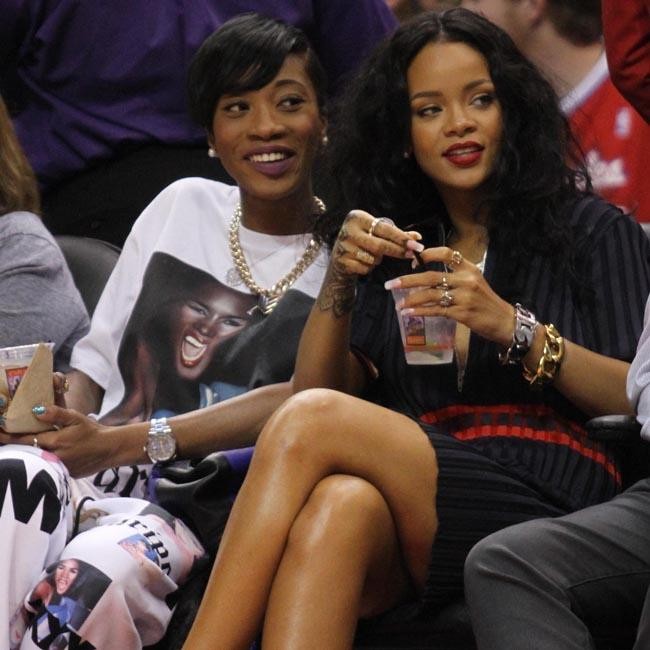 Rihanna enjoyed a cold beverage as she enjoyed the Clippers game in Los Angeles with her best pal Melissa Ford. The ‘Pour it Up’ singer showed off her legs in a sporty blue dress accessorized with chunky jewellery and styled her hair into big curls.