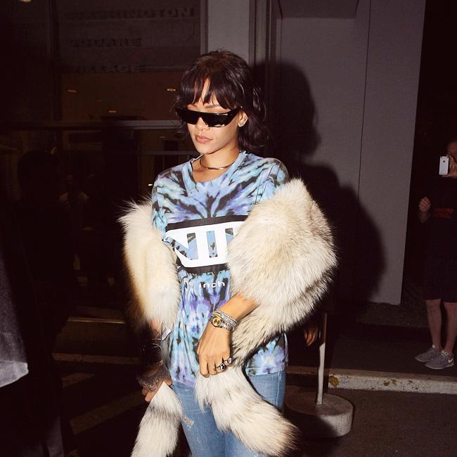 Rihanna may have just been to the dentist but she wasn’t prepared to let her fashion slide for the routine trip. The 28-year-old singer was spotted leaving the medical centre in New York on Wednesday (25.05.16) dressed in a blue tie-dye patterned t-shirt, blue denim jeans and a faux fur scarf.