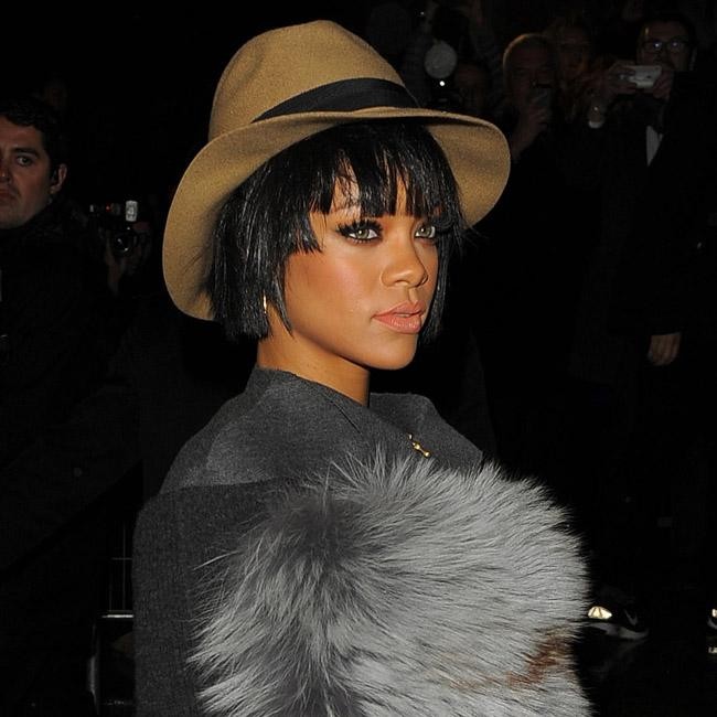 Rihanna made a glamorous arrival to Lanvin fashion show in Paris when sporting a fur stole and a trendy trilby hat.