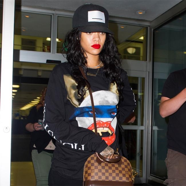 Rihanna dressed casual in a jumper, jeans and baseball cap as she arrived in New York city. She also wore bright red lipstick and carried a Louis Vuitton bag.
