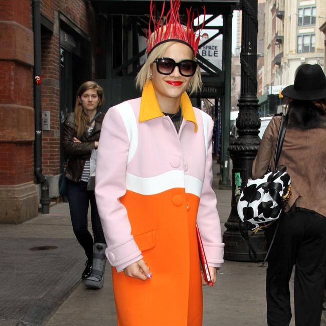 Rita Ora showcased her eccentric style in a vibrant coat and quirky red headband as she stepped out in New York City.