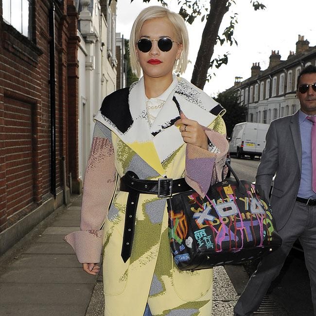 Rita Ora wrapped up in a patchwork quilt-style coat as she made her way to the studio in London. The singer added a black graffiti-printed bag and a pair of round-framed sunglasses.