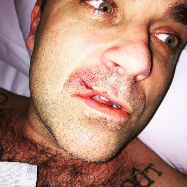 Robbie Williams has been left with a cut lip after losing a fight with his computer.