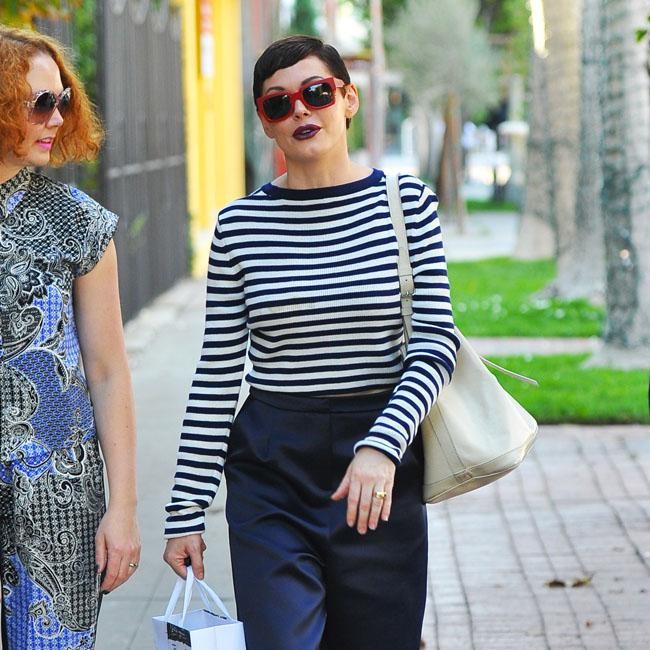 Rose McGowan enjoyed some retail therapy in West Hollywood on Tuesday (09.12.14), popping out to the area’s Marni store. The 41-year-old actress wore cut length navy trousers and a striped top, but brightened up the otherwise plain outfit with large red sunglasses and small, fluorescent heels.