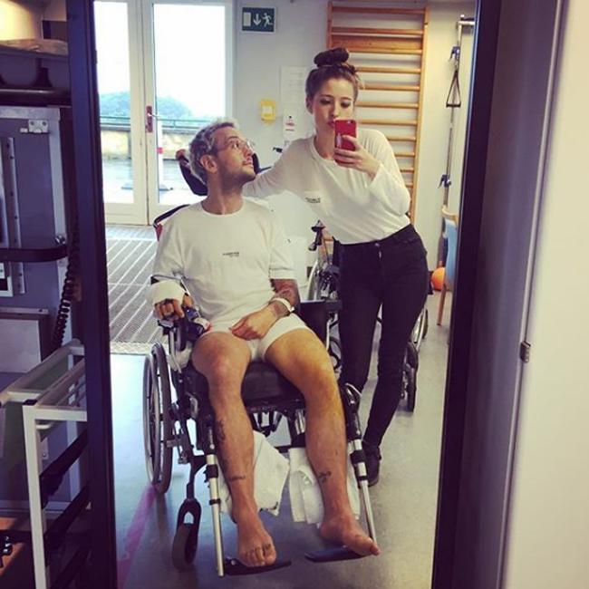 Alongside a picture of himself in a wheelchair next to his girlfriend Emily Smith, tagged at Nordsjællands Hospital , he wrote: "If I haven’t been texting you back it’s because I fell off a 2nd floor balcony in Denmark and broke my leg in 4 places, pelvis, hip, foot, ribs, shoulder blade, punctured a lung and smashed my left hand to pieces. I know a wise man once said ‘boys will be boys’ but seriously I drank too much and was careless and please don’t abuse your privileges. I think I’m going to do the next 30 years sober. Thank you to my gf @loveisenough for flying over to spoon feed me and my mama for doing the same. To quote Garth Marenghi ‘it really hurts’ (sic)"
