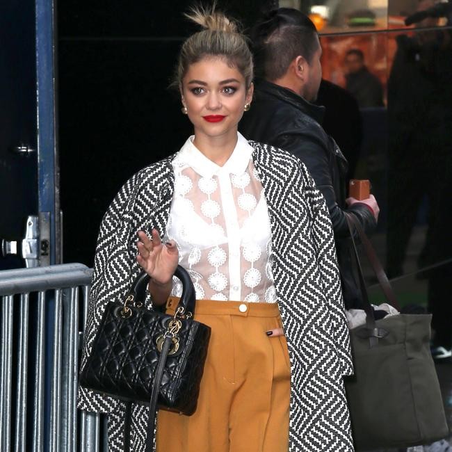 Sarah Hyland looked in great spirits in a fabulous outfit as she arrived at ABC Studios in New York on Tuesday (21.10.14) for an appearance on ‘Good Morning America’. The 23-year-old ‘Modern Family’ star wore high-waisted trousers and a see-through blouse, completing the outfit with a large black and white patterned coat.
