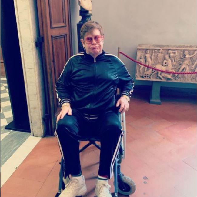 The 71-year-old singer – who has sons Zachary, eight, and Elijah, six, with husband David Furnish – refused to let his injury stop him from visiting the Uffizi Gallery in Florence, Italy, so used a wheelchair to help him get around the museum on Thursday (11.04.19).