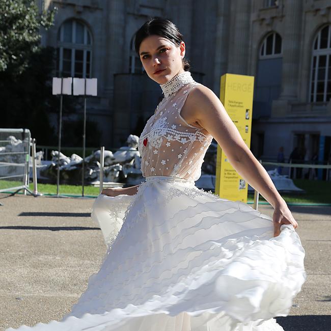 The 30-year-old singer – whose real name is Stéphanie Sokolinski – rocked a white sheer lace dress to the show at Paris Fashion Week and posed holding the skirt in the air with a fierce look on her face.