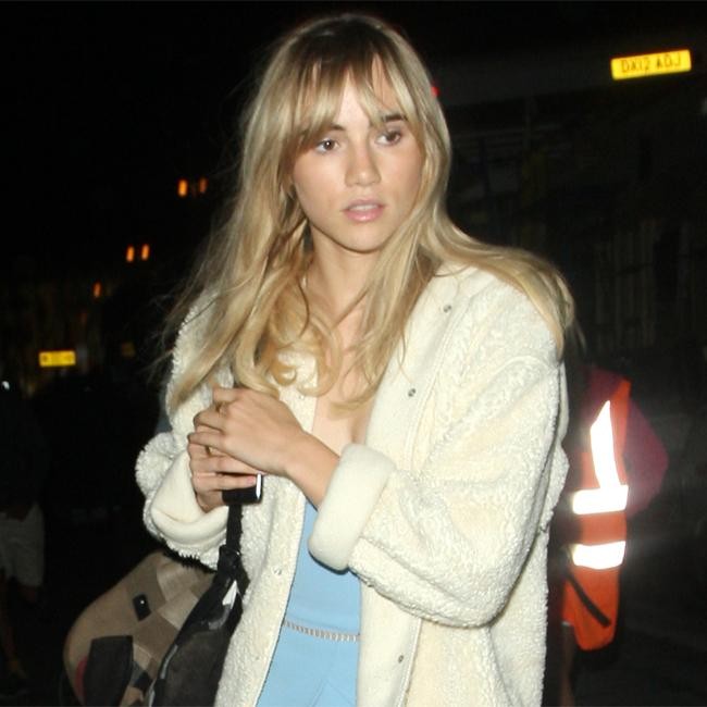 Suki Waterhouse looked smart in a baby blue dress and a white fleece jacket as she visited her boyfriend Bradley Cooper on the set of his new movie, ‘Adam Jones’ in London.