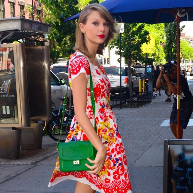 Taylor Swift looked stunning in a red floral print dress as she left her apartment in New York City. The singer added a vibrant green bag and red lipstick to finish off her look.
