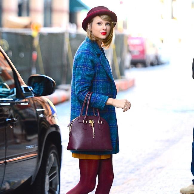 Taylor Swift has had a relentless month of promoting her new album ‘1989’, so treated herself to a trip back home on Monday (10.11.14). The ‘Shake it Off’ singer wore stylish maroon tights and a blue tweed coat as she returned to her New York apartment.