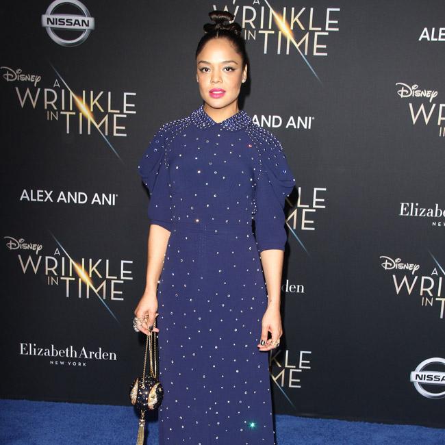 Tessa Thompson looked flawless in a navy gown with pearl gems scattered across the dress at Disney’s ‘A Wrinkle In Time’ premiere in Los Angeles.