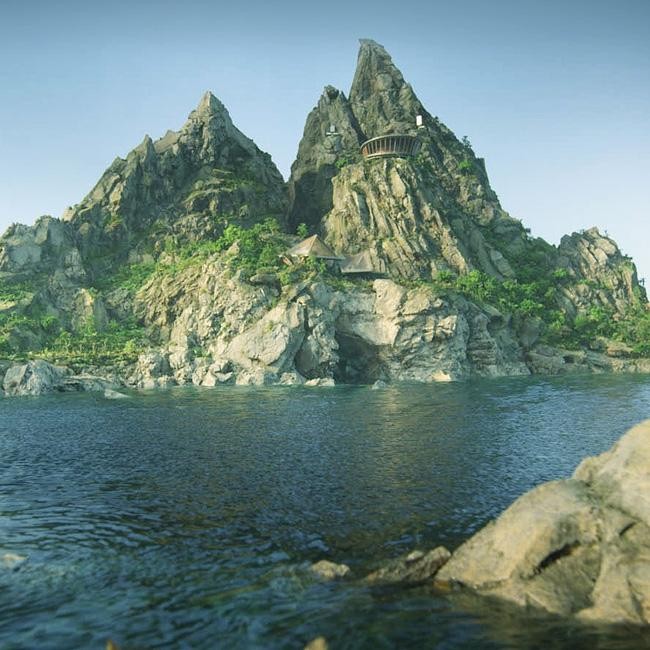 The picture shows the isolated, high-tech Tracy Island – which memorably boasted its own retractable swimming pool and tilting palm trees – surrounded by serene seawater.