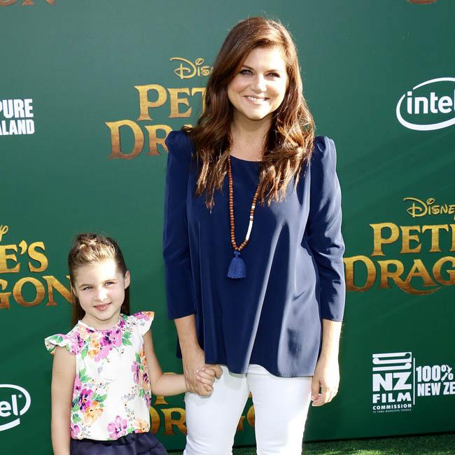 Tiffani Thiessen looked effortlessly stylish in tight white jeans and a blue top at the world premiere of ‘Pete’s Dragon’ at the El Capitan Theatre in Hollywood on Monday (08.08.16).