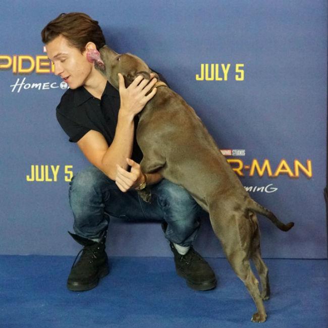 The 21-year-old actor – who plays the web-slinging titular character in the forthcoming Marvel Studios film – has been separated from his four-legged friend Tess for months while he’s been getting ready for his promotional commitments for the blockbuster, so it’s no wonder the hunk jumped at the chance to show off his canine friend when they were reunited at the event at the Ham Yard Hotel this morning.