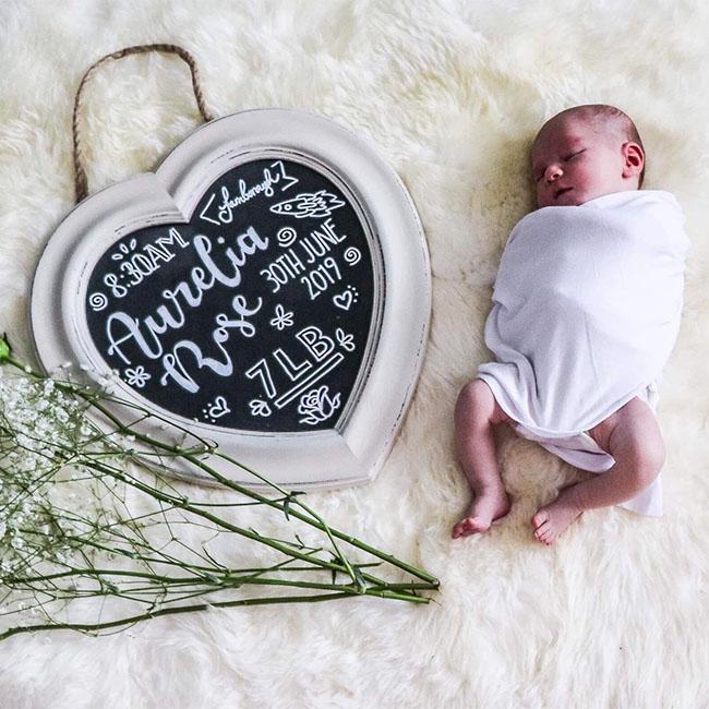 The little girl was born at 8.30am on June 30 and weighed 7 pounds, the board placed next to Aurelia reveals.