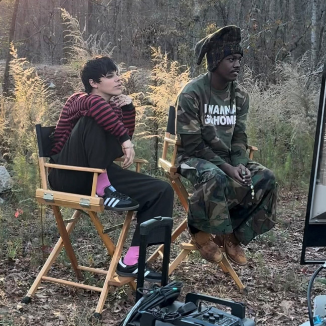 The pair can be seen sitting in directors’ chairs on what looks like a music video set.